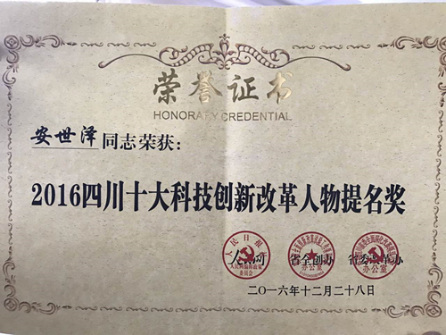 院長安世澤獲 “2016四川十大科技創新改革人物”提名獎