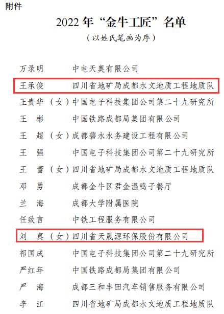 2022年12月2日,中共成都市金牛區委組織部成都市金牛區總工會發布《關于命名2022年“金牛工匠”的決定》,四川省天晟源環保股份有限公司(簡稱“天晟源環保”)王承俊、劉真、童賢清三人獲得“金牛工匠”認定。至此,天晟源環保已有5人獲得“金牛工匠”稱號認定。